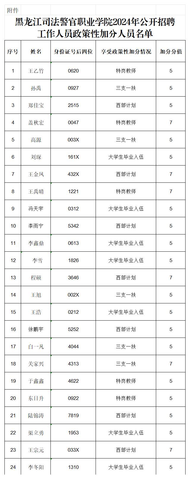 2024年黑龙江司法警官职业学院招聘工作政策性加分人员名单公示